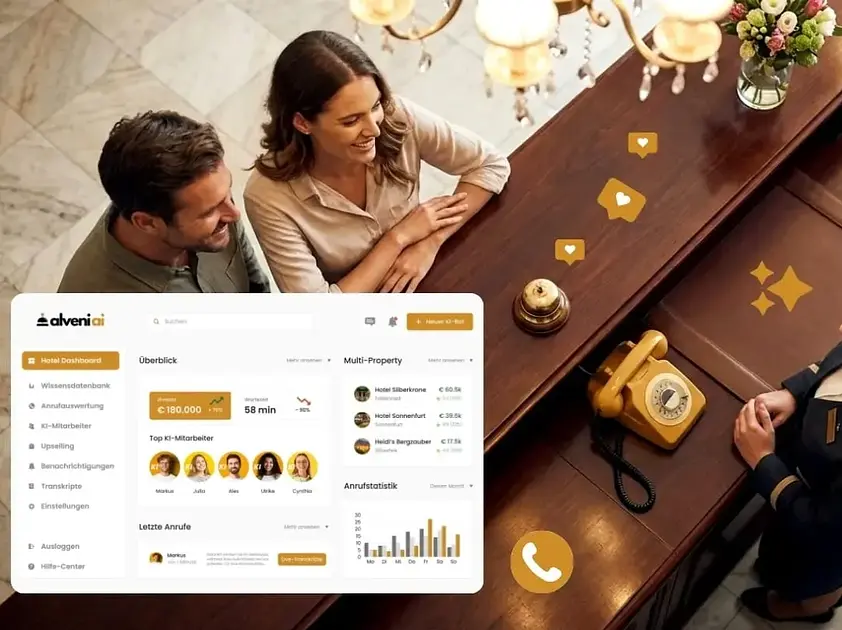 Der KI-Telefonassistent von Alveni AI wurde speziell für die Hotellerie entwickelt und übernimmt eingehende Anrufe vollständig automatisiert – rund um die Uhr, ohne Wartezeiten und ohne Qualitätsverlust. Die KI spricht natürlich mit Ihren Gästen, versteht Anliegen in Echtzeit und beantwortet Fragen zuverlässig in bis zu 30 Sprachen. Neben der klassischen Beantwortung von Gästefragen übernimmt der Telefonassistent auch aktive Aufgaben wie Upselling, Weiterleitungen oder die strukturierte Erfassung von Anfragen.